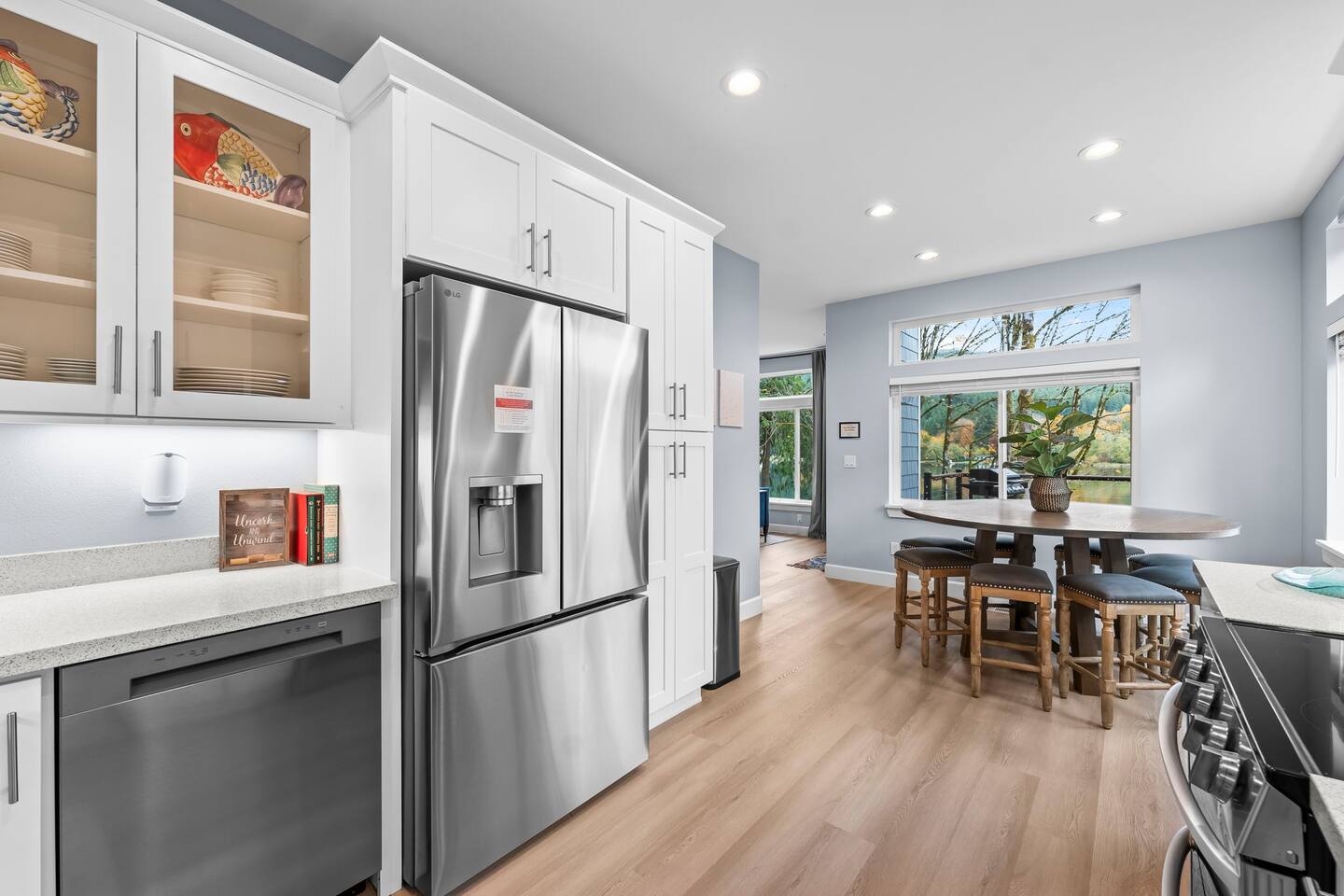 Welcome to your perfect getaway in beautiful Bremerton—a spacious lake house just 90 minutes from Seattle. Designed for the whole family, this sunny, three-story retreat offers the perfect blend of modern comforts and nature’s charm. With sweeping views of a private lake, thoughtful amenities, and plenty of room for young children, pets, and adults to spread out, it’s an unforgettable stay in the heart of the Pacific Northwest. 🏡 The Main House Inside the main house, you'll find natural light streaming through large windows, a sectional sofa perfect for cozy movie nights, and high-speed Wi-Fi for staying connected. The open-concept main living area invites togetherness, while the dedicated workspace offers a spot for remote work if needed. Downstairs, you will find an entire in-law suite complete with a queen bedroom, bathroom, laundry room, eat-in kitchen, and living space with a direct walk-out to the lake. 🛏️ Sleeping Spaces The primary suite on the main floor boasts breathtaking views of the lake, a walk-in shower, a bidet, and modern comfort for a restful night. Upstairs, two additional bedrooms—one with a queen bed and one with twin beds—are perfect for kids or guests. The bedroom with twin beds includes a magical playroom nook inside the closet, beloved by small children and those young at heart. The downstairs in-law suite boasts a quiet queen bedroom away from the hum of the rest of the home. 🎮 Game Time + Chill The upper level features a game room packed with fun games—from foosball and board games to a mini library, puzzles, and classic DVDs. Stream your favorites on the smart TV, or curl up with a book in one of several cozy living spots. 🍽️ Kitchen & Dining Create meals in the two large kitchens, both fully stocked and featuring stainless steel LG appliances and a charming coffee bar. The large dining table seats 8 comfortably—perfect for reconnecting after a day on the water. 🌅 Outdoor Living Step outside to discover multiple outdoor spaces, including a large deck, outdoor seating, and dining areas overlooking the stunning views of the lake. Enjoy direct access to a private dock, where single kayaks await your adventurous guests. Calm waters make this an ideal spot for floating, swimming, or skipping rocks with the kids. 🐾 Dog-Friendly Paradise With exclusive access to the entire property, we happily welcome up to two dogs. They’ll love the fresh air, outdoor patio, and nature trails as much as you will. 📍 Central Location | Easy Access Tucked into a serene escape on a private lake, this home offers a convenient location just a short drive from historic downtown Bremerton, popular restaurants, and the Olympic Peninsula. With free parking, private access, and a front door keypad entry, your check-in is easy and your experience is private.