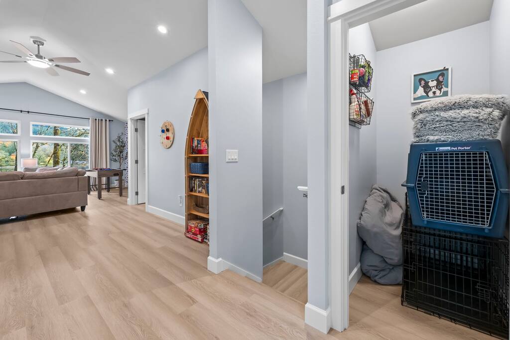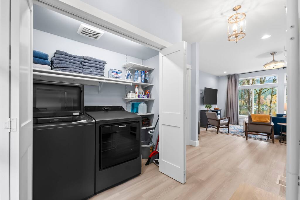 Welcome to your perfect getaway in beautiful Bremerton—a spacious lake house just 90 minutes from Seattle. Designed for the whole family, this sunny, three-story retreat offers the perfect blend of modern comforts and nature’s charm. With sweeping views of a private lake, thoughtful amenities, and plenty of room for young children, pets, and adults to spread out, it’s an unforgettable stay in the heart of the Pacific Northwest. 🏡 The Main House Inside the main house, you'll find natural light streaming through large windows, a sectional sofa perfect for cozy movie nights, and high-speed Wi-Fi for staying connected. The open-concept main living area invites togetherness, while the dedicated workspace offers a spot for remote work if needed. Downstairs, you will find an entire in-law suite complete with a queen bedroom, bathroom, laundry room, eat-in kitchen, and living space with a direct walk-out to the lake. 🛏️ Sleeping Spaces The primary suite on the main floor boasts breathtaking views of the lake, a walk-in shower, a bidet, and modern comfort for a restful night. Upstairs, two additional bedrooms—one with a queen bed and one with twin beds—are perfect for kids or guests. The bedroom with twin beds includes a magical playroom nook inside the closet, beloved by small children and those young at heart. The downstairs in-law suite boasts a quiet queen bedroom away from the hum of the rest of the home. 🎮 Game Time + Chill The upper level features a game room packed with fun games—from foosball and board games to a mini library, puzzles, and classic DVDs. Stream your favorites on the smart TV, or curl up with a book in one of several cozy living spots. 🍽️ Kitchen & Dining Create meals in the two large kitchens, both fully stocked and featuring stainless steel LG appliances and a charming coffee bar. The large dining table seats 8 comfortably—perfect for reconnecting after a day on the water. 🌅 Outdoor Living Step outside to discover multiple outdoor spaces, including a large deck, outdoor seating, and dining areas overlooking the stunning views of the lake. Enjoy direct access to a private dock, where single kayaks await your adventurous guests. Calm waters make this an ideal spot for floating, swimming, or skipping rocks with the kids. 🐾 Dog-Friendly Paradise With exclusive access to the entire property, we happily welcome up to two dogs. They’ll love the fresh air, outdoor patio, and nature trails as much as you will. 📍 Central Location | Easy Access Tucked into a serene escape on a private lake, this home offers a convenient location just a short drive from historic downtown Bremerton, popular restaurants, and the Olympic Peninsula. With free parking, private access, and a front door keypad entry, your check-in is easy and your experience is private.